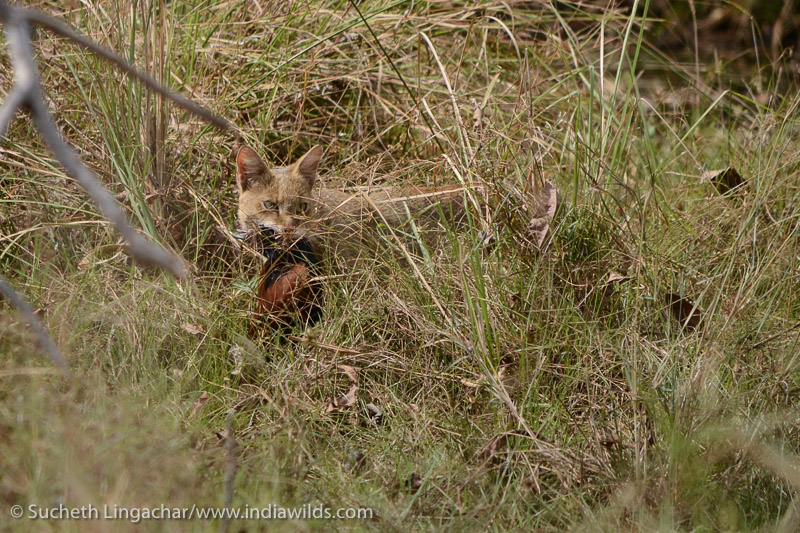 Jungle Cat with Coucal kill in Tadoba Andhari Tiger Reserve