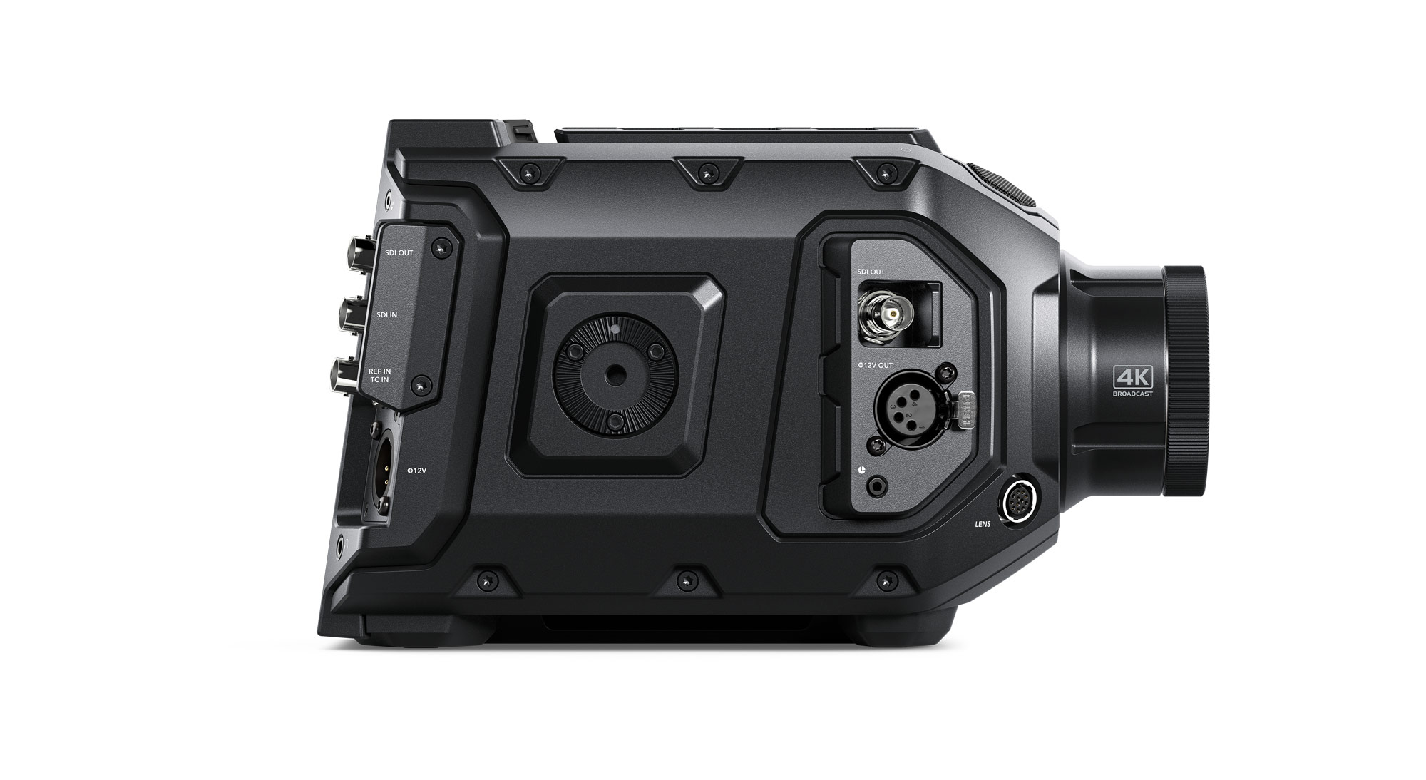 All of the connections on URSA Broadcast are standard television industry connectors so customers don’t need expensive, proprietary cables. The camera features multi rate 12G‑SDI connections for video output and return program feed input. Both connections automatically switch speed so they work with all HD and Ultra HD formats up to 2160p60 over a single cable. In addition, URSA Broadcast features HD-SDI monitoring out, 2 LANC inputs, balanced XLR audio with phantom power, and timecode/reference input. A 12 pin Hirose connector provides analog and digital broadcast lens control for powering and controlling SD, HD and Ultra HD lenses. There’s also a 4 pin XLR 12V DC power output and HD-SDI monitor output that can be used with Blackmagic viewfinders or any third party viewfinders and monitors.
