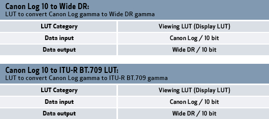 The Canon Log feature includes two Look Up Tables (LUTs) that correct the recorded image’s gamma and color space when viewed on an external monitor. With Canon Log 10 to Wide DR LUT, the video file is converted to Wide Dynamic Range gamma, with well-preserved highlights and shadow detail. With Canon Log 10 to ITU-R BT.709 LUT, the file is converted to ITU-R BT.709, providing conventional camcorder specs for viewing in a color space consistent with an HDTV.