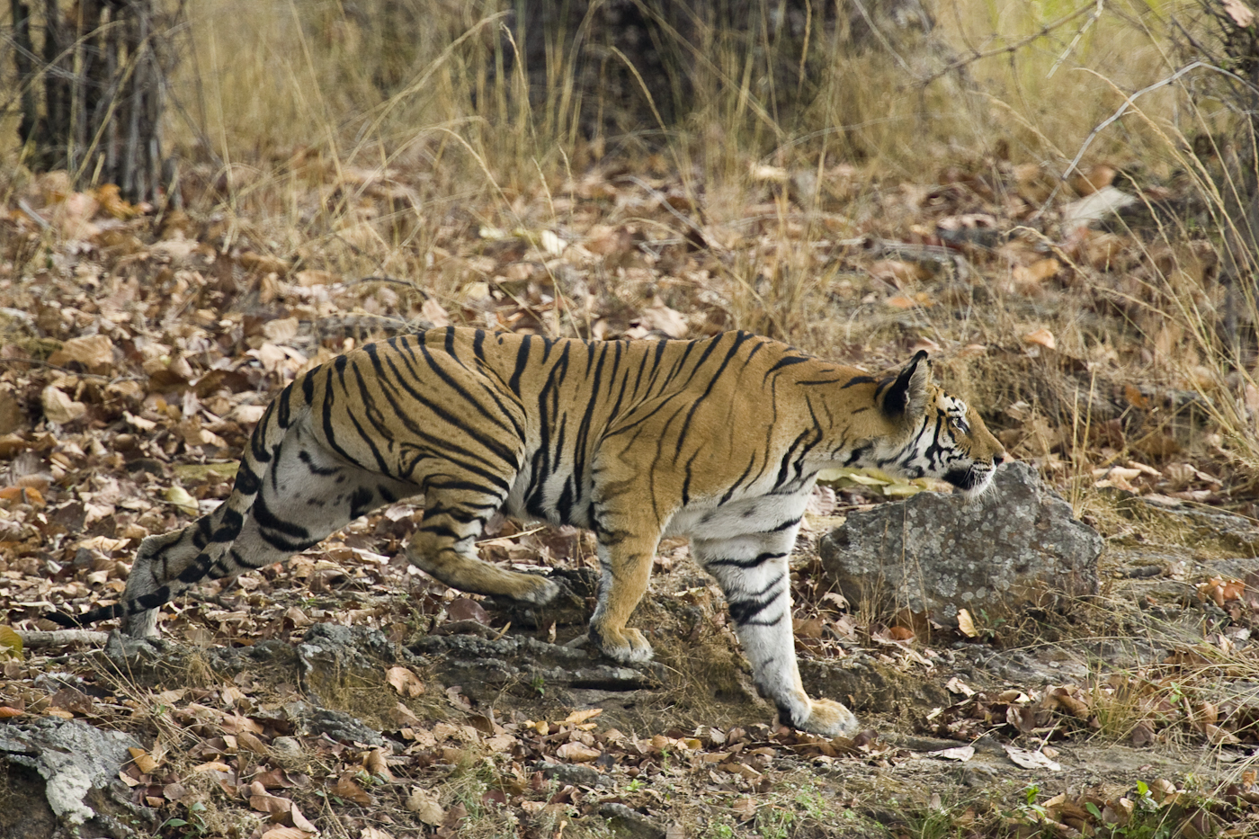 A wild tiger stalks its prey in a summer evening in Bandhavgarh National Park, India. Its raised right hind paw is about to fall on the exact spot where the front right paw is, a typical tiger behaviour.