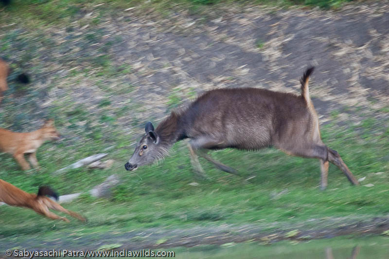 After this one attack the mother didnt participate in attacks any more. The number of wild dogs at that spot were now eight and the other Sambar was now launching vicious attacks on the wild dogs. It even tried to strike at the wild dogs with its front right foreleg. I had never seen the use of foreleg before by a herbivore in defending or attacking. However, A. A. Dunbar Barander has seen this behavior before with his tame dogs. He writes A herd of five hinds once rounded on a pack of large useful dogs of mine, and knocking the dogs over right and left drove them right up to my feet, taking all further desire to molest sambar hinds out of their composition for their time being.