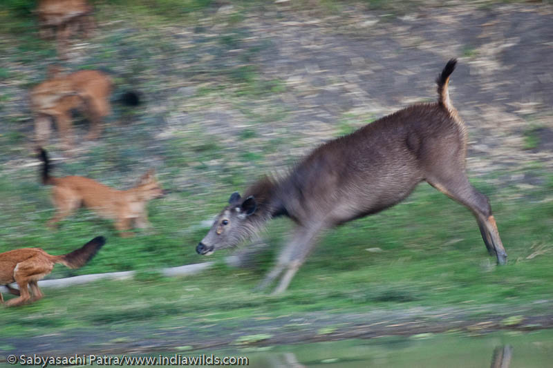 Suddenly the Sambar on the left – first two a couple of steps towards the wild dogs stamping its feet in the process to intimidate the dholes (Cuon alpinus). The Sambars tail was cocked up, as one expects to see it when the sambar is alarmed or when two stags duel with each other. The ruff of hair around its neck were standing straight up as if carefully combed to remain erect like the feathers on the roman emperors helmet. Its body partially wet due to the water splashing on it was still up, perhaps as a sign of danger. Its ears were straight and wide and angled ahead. Its neck was lowered a bit and stretched ahead with its ears in line with its body.The Sambar then increased its speed and moved into a trot and reached near a wild dog(Cuon alpinus)and started watching it. The wild dog (Cuon alpinus)like an opportunist, moved a couple of steps ahead as if it will launch itself on the sambars head and catch hold of either ear, eye or nose. The Sambar was now standing very straight and showed its full height and its neck was angled lower and ahead towards the wild dog. The wild dog sensed that the Sambar will charge and immediately jumped to its left and ran away. The sambar stopped in its tracks and then turned its head towards its left as by this time two more wild dogs had appeared in the scene hoping to attack the Sambar. The Sambar then lunged forward at the dhole on its left. The head of the Sambar was angled down and its hind legs were in the air as if it wanted to crush the dhole by pinning it to the ground. The dhole started running for dear life where as the other wild dog(Cuon alpinus)was watching the scene carefully, suggesting they are expert players in this game.
