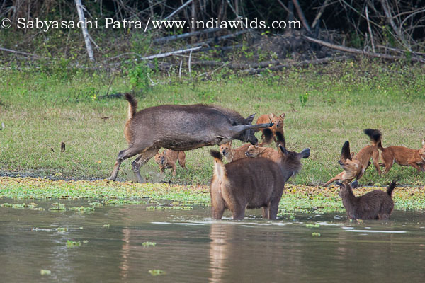 Wild India | Dholes or Wild dogs attacking sambar in water. These two sambar are in the frontline stamping their feet in water.