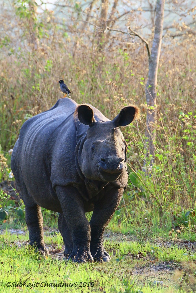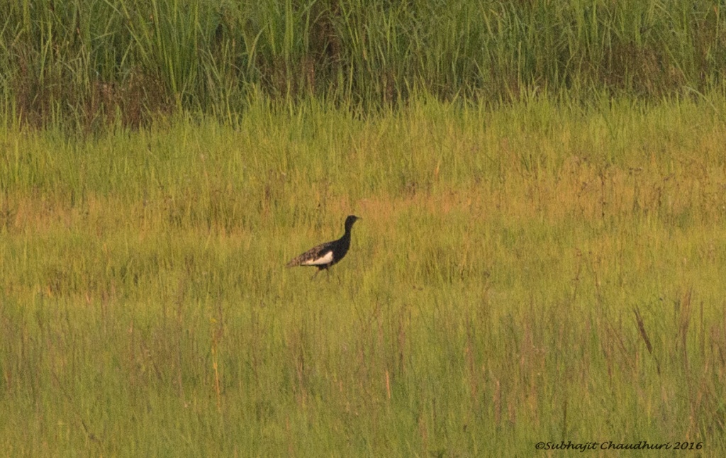 A day off from office resulted a long weekend on March last – due to combination of Holi & Good Friday. Like most others I took a break making most of the opportunity. Manas National Park has been in my wish list for long. Boarded 12345 Saraighat Express from Howrah. It was running smoothly & we got down at New Bongaigaon at 6.30am. Our Bansbari lodge sent one sumo to pick us up. Took a brief halt at Barpeta Road forest office to collect our permits to stay at Mathangudi Lodge which was pre-booked via phone. Just opposite to that office we saw a roadside eatery and quickly had our breakfast . Checked into Birna Tourist Lodge at Bansbari. After a brief birding session at opposite tea-garden we set set-off for the safari via gypsy. Next day morning some of my partners went for Elephant Safari and rest two of us went for brief walk trough trails of Bansbari. The walk turned out more fruitful in terms of sighting. We found one collared Rhino at a very short distance behind fence. After coming back for breakfast we took the gypsy to proceed towards Mathanguri. Overall we stayed one night at Bansbari and two nights on Mathanguri. Though I could get only the dormitory, later I found Lower Bunglow is much more appealing contrary to popular choice of Upper Bunglow available in several online forums/ reviews. We did two full day safari and two half day safaris on gypsy. Manas made my lifer list enriched with brilliant sighting of Bengal Florican male display , Rufous Necked & Wreathed Hornbill , Silver breasted broadbill, Slender billed Babbler, Swamp Francolin , Black Breasted Parrotbill etc. We could spot/hear and photograph the following bird species – [arranged alphabetically for common English names].