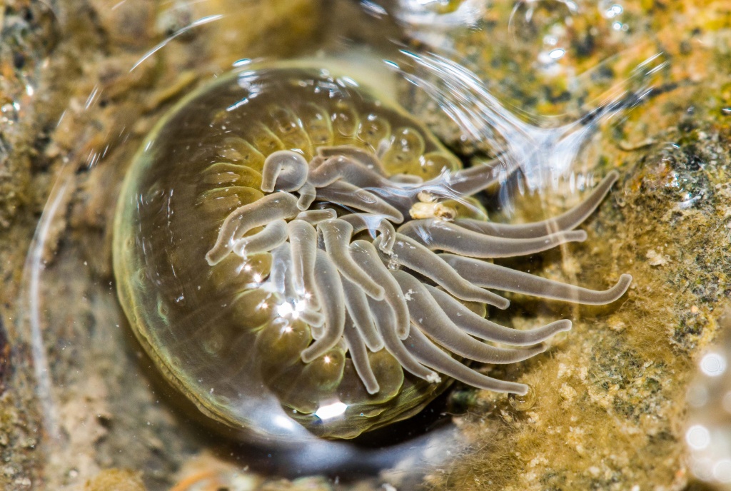 A close up of a tiny sea anemone seen along the shore during the low tide, this beauty seemed to be contracted for some reason and post some moment started to open up, not sure if that was due to the mild wave. There seemed to be many of them, but this was situated at the shallowest point and seemed isolated from the other clusters
