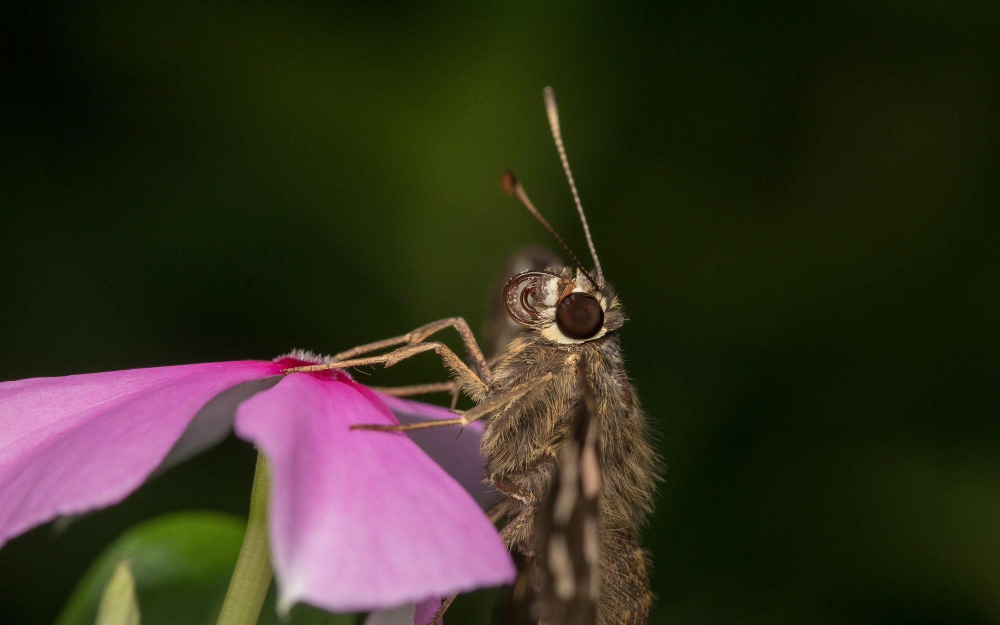 Its interesting how a normal society’s garden can have such an interesting variety of natural beauties. While exploring the garden section, usually have seen bark mantis several times, hence while searching for the evasive predator, stumbled upon some fast moving butterfly. After several minutes of chasing the beauty eventually, the weathered, yet hyper active butterfly, decided to take some brief rest on the periwinkle flower and on close observation, spotted it extend its curled up proboscis and then curl it back in. Later while I could manage to get pretty close and frame the beauty, realized that its proboscis had some pollen, not sure if it had sucked it out from this flower or from earlier flower that it might had visited. After a brief rest though it just flew off almost vanishing in the dark evening environment
